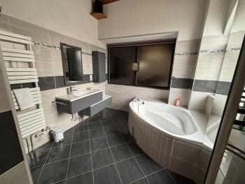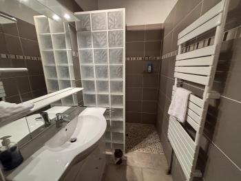 Env. 135 M² hab entièrement de pl-pied comprenant :Très belle chambre avec dressing env.33 M², salle de bains complète, wc, salle d'eau avec douche italienne, wc, magnifique séjour-salon avec coin cuisine (hotte, plaque) env.80 M². Parking - Eau , chauffage, electricité inclus dans les charges.
